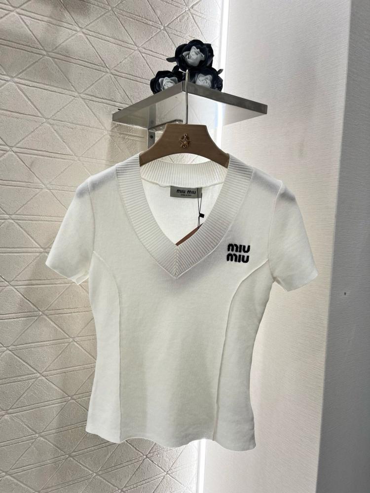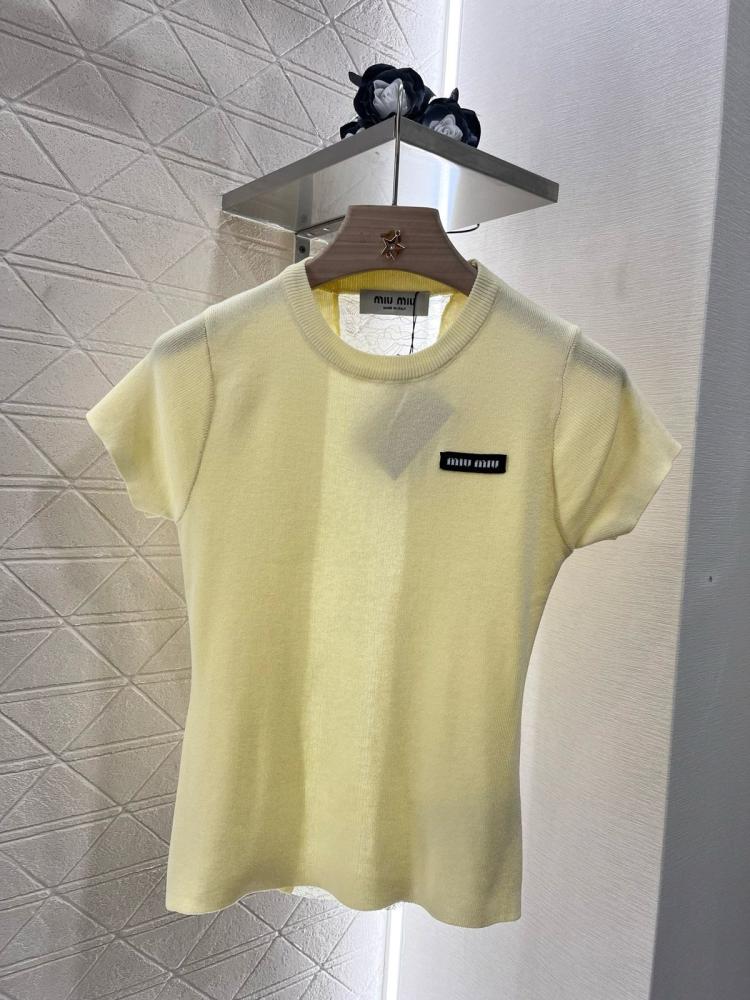 تي شيرت نسائي Miu Miu باللونين الأصفر والأبيض يجمع بين الحيوية والأناقة مما يجعله خياراً مثالياً لإطلالة مميزة تصميمه العصري يضمن لك راحة استثنائية سواء كنت في نزهة أو في مناسبة غير رسمية استمتعي بإطلالة مشرقة وجذابة في كل مرة ترتدينه.لا تفوتي فرصة الحصول على هذا التي شيرت الرائع واطلبيه الآن من fashioholicksa لتحصلي على إطلالة مميزة وجذابة